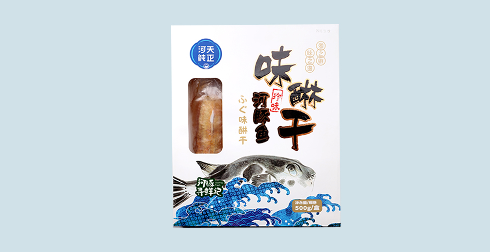 味醂魚干 天正味醂河豚魚干,用料嚴格、工序考究、傳承古法。我們取河豚魚精肉,去骨去膜、標準切割,經數(shù)天低溫風干,祛除魚肉內水分,再添加味醂調味料,浸入鮮甜美味。解凍后,烤箱烘烤便可食用。